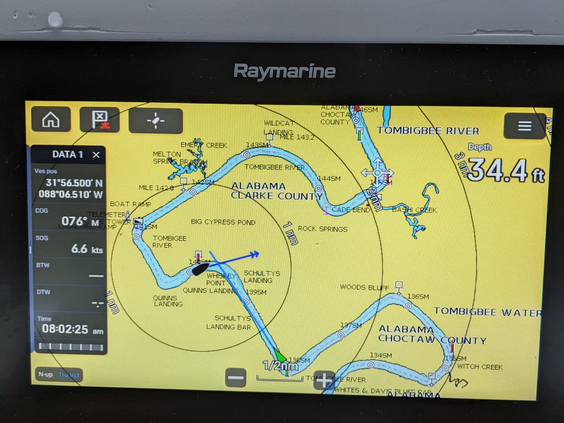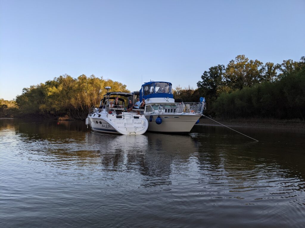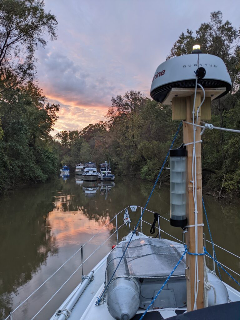 After the Tom Bigbee we had the Black Warrior river to get through, which had a few more incredible anchorages, beautiful sunsets and a lot of good times with friend boats. At one point we were traveling with a friend sailboat that had had their mast put back on further up the river and had to call the railway bridges to open for them. One day a bridge would not respond on VHF or telephone. Douglas and I went through the bridge to read the water gauge which wasn’t super clear. We sent a picture to our friends and told them that we thought it was about 48 feet of clearance, they thought it was almost 50, which is the height they needed. So they decided to go through. The whole way through their VHF antenna scraped the bottom of the bridge! It was scary, but they made it and didn’t even lose the antenna.