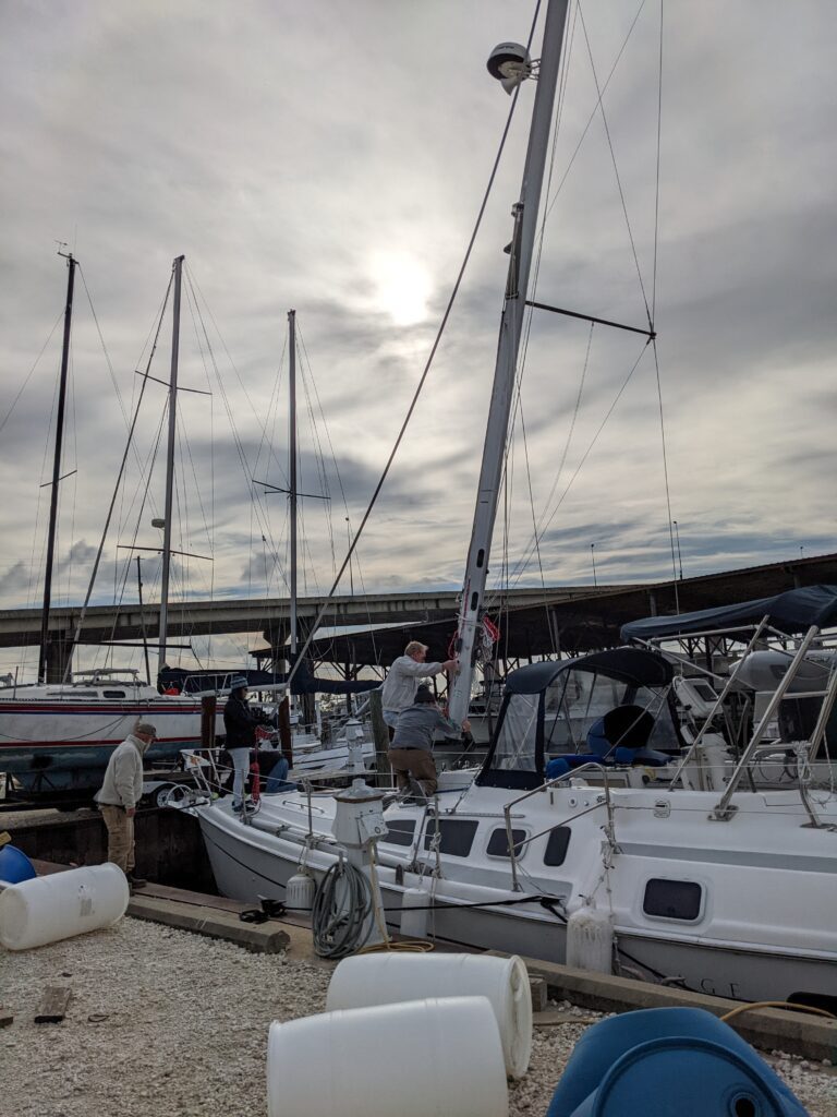 Once we got past the industrial docks and into the channel we were met with dozens of dolphins. They stayed with us as we made our way to the Dog River Marina. When we got to Dog River and pulled up to the dock our mast was there waiting for us right next to the dock. It had been packaged perfectly, thanks to Racine Riverside Marine. What a relief! We felt very good about our decision not to carry it strapped to the boat like some other people had done. It just isn’t worth the risk if something bad happens and you end up damaging your rig. We hired a professional rigger to help us get everything set up and we learned a lot from him.