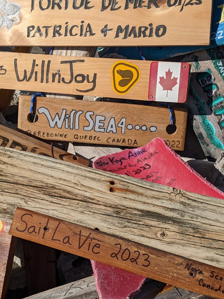 While in Wardwick Wells we also did a bit of hiking. One day we went up a path where people put all manner of crazy signs with their boat names on a large pile of the same. The view from the top was spectacular! The next day we took a dinghy ride to another area called the pirates lair, which is basically a cutout under the rocks from one side of the island to the other in a narrow point. Douglas and Tony tried for some time to figure out a way through it without smashing in their heads on the ceiling. Eventually they gave up and we all hiked up and walked over the opening. We could look through the volcanic stone into the cave and we were sure glad that they hadn’t really tried to go through. It looked like a total death trap, but maybe when there is no current or waves it would be safe. We will never know.