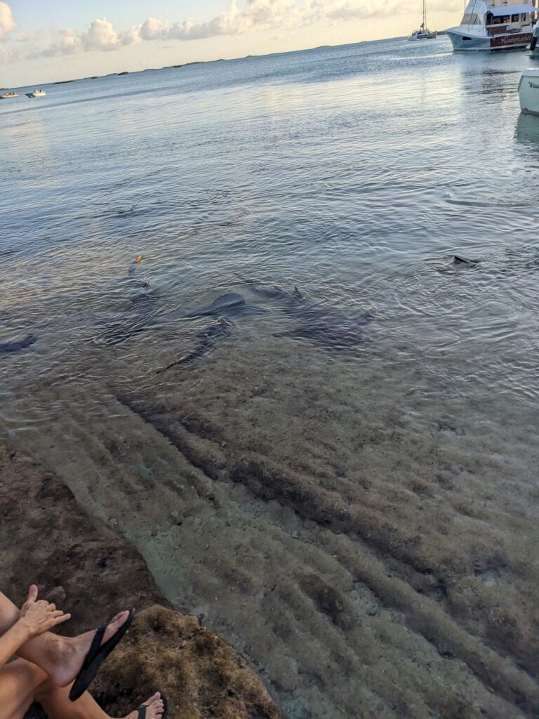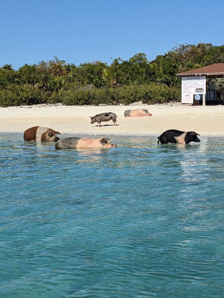 On February 25th we decided to fill up our fuel tank and move on from Staniel Cay to anchor nearby at Big Major beach where the famous swimming pigs are. We were told to bring vegetables for them, which we did since it seems like a strategy to keep them fed for free by the owners. As soon as we arrived we discovered that the pigs were not little cute piggies at all. These were huge pigs trying to board your dinghy to get more food, and man could they swim fast. I got freaked out when they started to try to get their hoofs over the dingy and I made Doug reverse. It was pretty hilarious, and they were still cute, but I had zero interest in swimming with them!