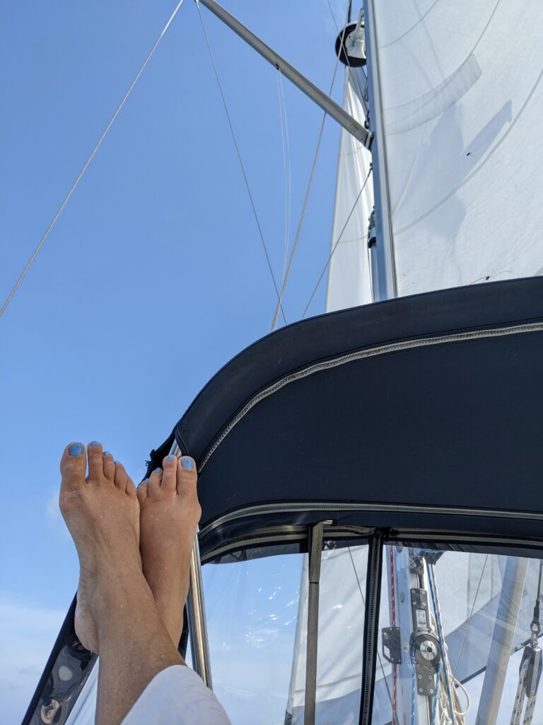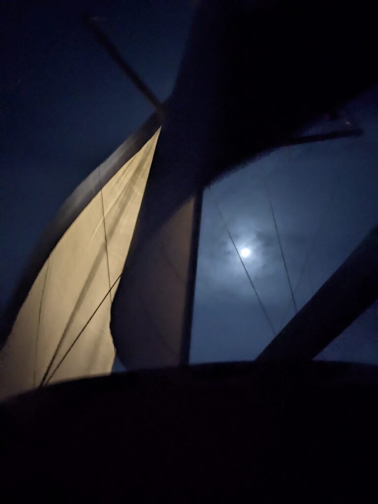 At 8PM when the motor was running well, I told him to go get some sleep because he would probably be up all night dealing with that issue again. Yet, when he woke up at 6AM I was still sitting there motoring away after a beautiful calm peaceful night of watching the lightning off in the distance and the beautiful reflection of the stars on the water. I even brought out a bit of sail at one point although the wind was light it gave me an extra knot of speed.